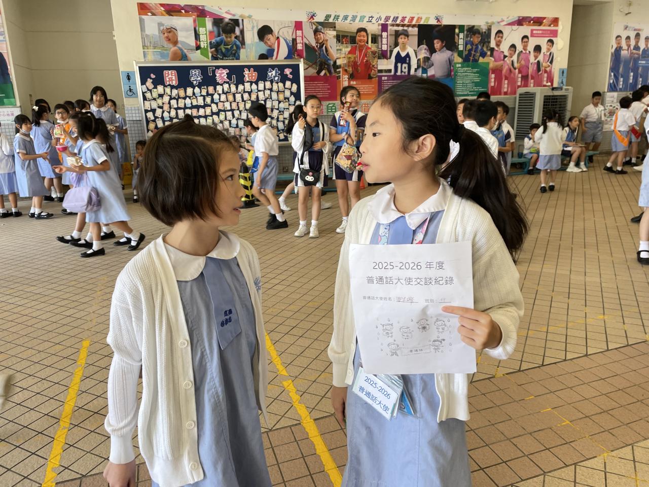 - 普通話大使逢星期二第一小息在操場和有蓋操場當值,用普通話跟同學交談。
